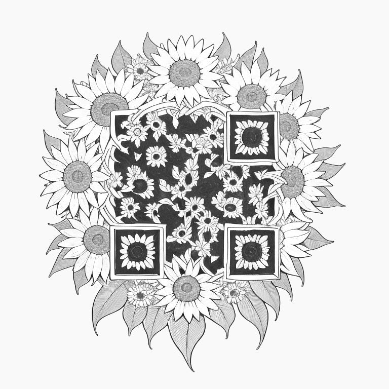 A wreath of sunflowers entwined with daisies, bringing together two of nature's most joyful and uplifting flowers. This crafted QR code tattoo radiates warmth and positivity, with the sunflowers symbolizing strength and the daisies representing purity. The QR code is expertly integrated into the design, adding a modern twist to the timeless beauty of the floral wreath.