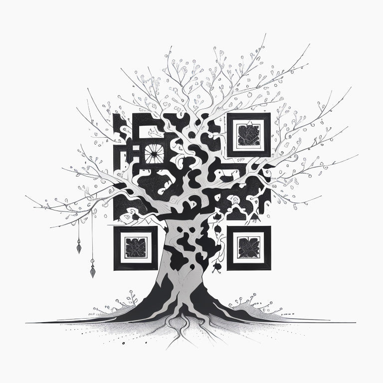 An ancient, large tree stands at the center of the composition, its branches sprawling with foliage, symbolizing eternity and longevity. This unique QR code tattoo celebrates the enduring power of nature, with the tree’s roots symbolizing strength and stability. The QR code is carefully integrated into the tree’s design, making it a modern tribute to the timeless cycle of life.