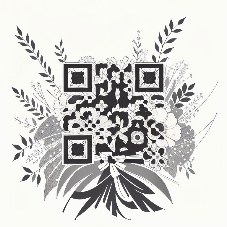 A bouquet of meadow flowers tied with a thin ribbon in the wind forms this art tattoo QR code. The flowers sway gently in the breeze, their soft colors contrasting with the ribbon's delicate curves. The QR code is seamlessly integrated into the composition, adding a modern twist to the timeless beauty of nature. This tattoo is ideal for those who appreciate simplicity and the beauty of the natural world.