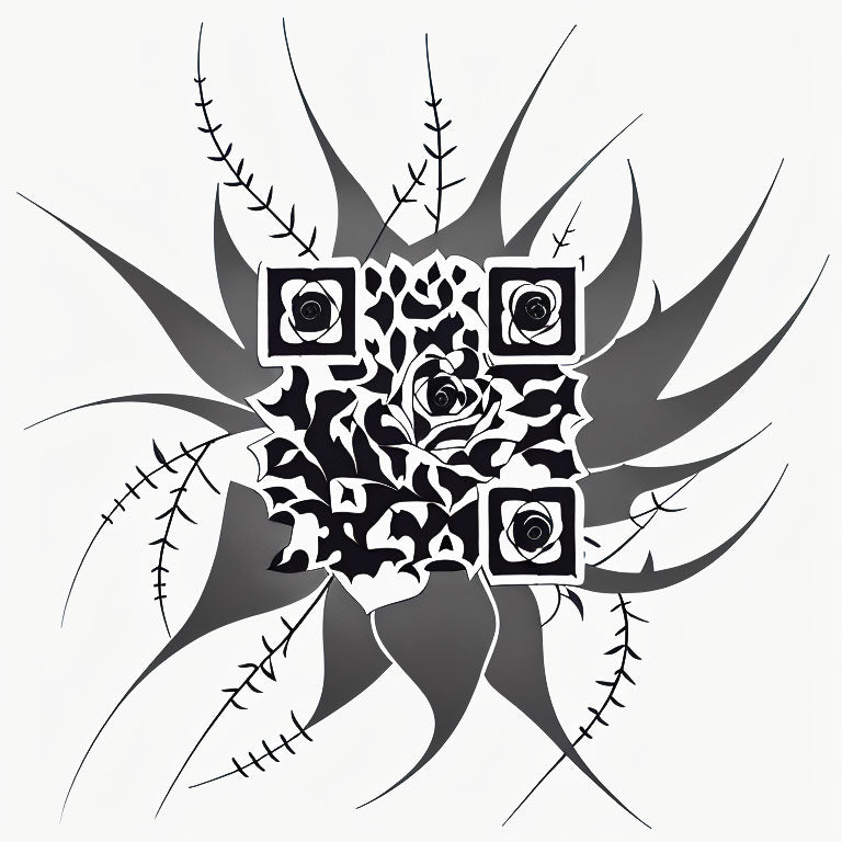 An intricately detailed rose with sharp thorns captures both the fragility and strength of beauty. The black ink drawing emphasizes the complexity of each petal, while the thorns add depth and contrast. A crafted QR code tattoo is woven into the composition, symbolizing hidden messages and the duality of nature’s allure. The QR code subtly enhances the tattoo with a contemporary digital edge.