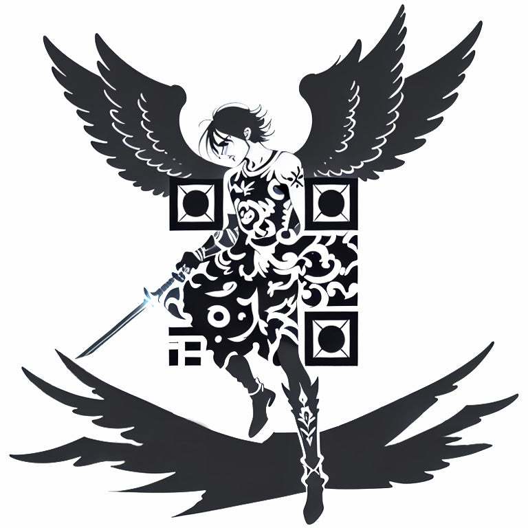 A heavenly warrior with glowing wings and a sword, depicted as a powerful and masculine figure. This unique QR code tattoo represents strength, protection, and divine guidance, with the warrior symbolizing courage and honor. The QR code is subtly integrated into the design, adding a modern element to this celestial representation of power.