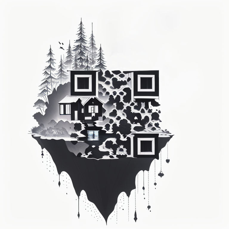 A floating island with a small cozy hut, mountains, a forest, and a waterfall flowing into the void creates a serene and magical scene in this unique tattoo QR code. The island represents isolation and peace, while the waterfall symbolizes the flow of life. The QR code is subtly embedded in the design, blending fantasy with contemporary artistry.