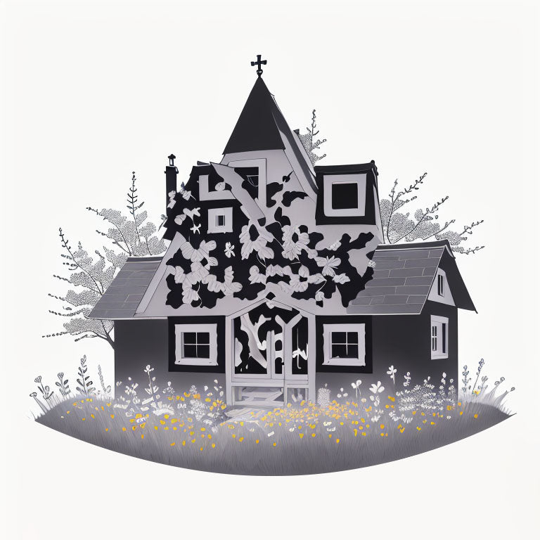 A peaceful meadow filled with flowers, with a small chapel in the distance, evoking a sense of serenity and spirituality. This unique QR code tattoo symbolizes harmony between nature and faith, with the flowers adding color and life to the peaceful scene. The QR code is subtly integrated into the design, adding a contemporary twist to this idyllic setting.