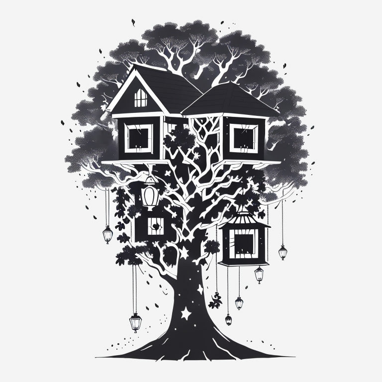 A whimsical treehouse is nestled among sturdy branches, glowing lanterns casting a warm, magical light against the night sky. Fireflies dance around, adding to the enchanting atmosphere of this hidden sanctuary, symbolizing childhood wonder and imagination. The fine ink detailing captures the delicate textures of wood, leaves, and light, creating a dreamy and nostalgic scene. At the core of the composition is a unique tattoo QR code, cleverly woven into the design, blending the magic of storytelling with digital connectivity, adding a modern touch to the timeless whimsy.