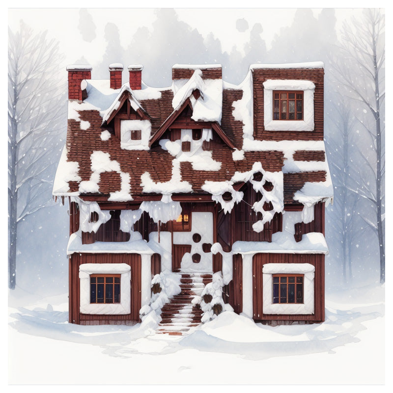 A charming snow-covered cottage, icicles hanging from its roof, glows warmly from within in this unique QR code. The watercolor painting style adds a dreamy ambiance with transparent layers and luminous details.