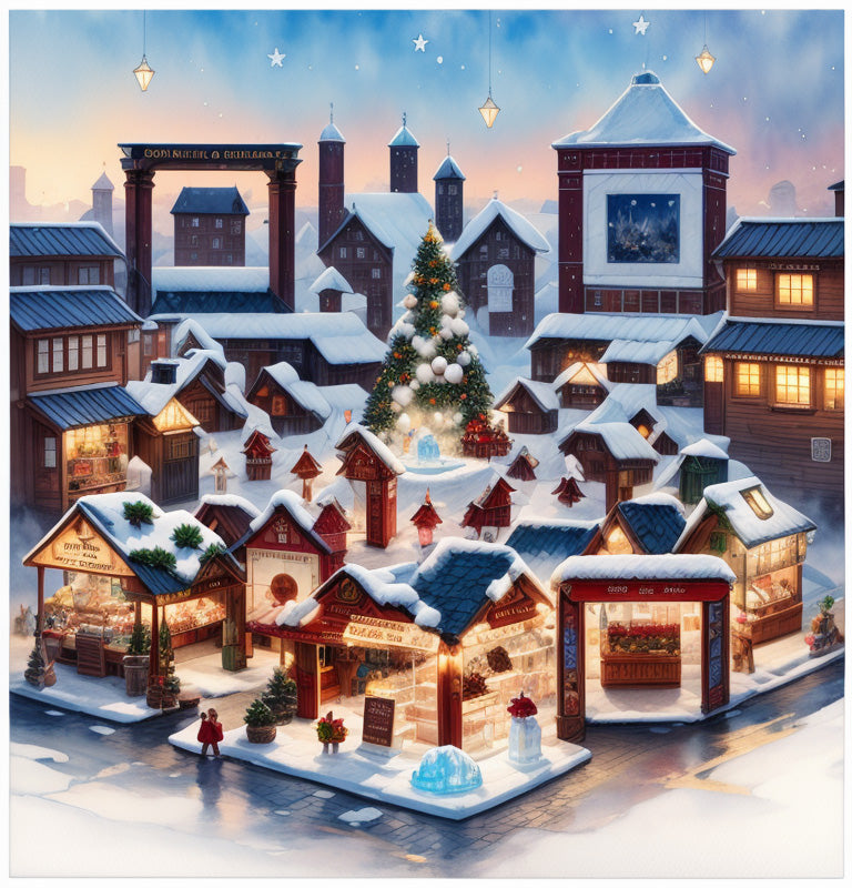 This QR code art depicts a busy town square with a central large Christmas tree and festive market stalls. The watercolor painting style gives the scene a light and dreamy quality, conveying the joyful spirit of the season.