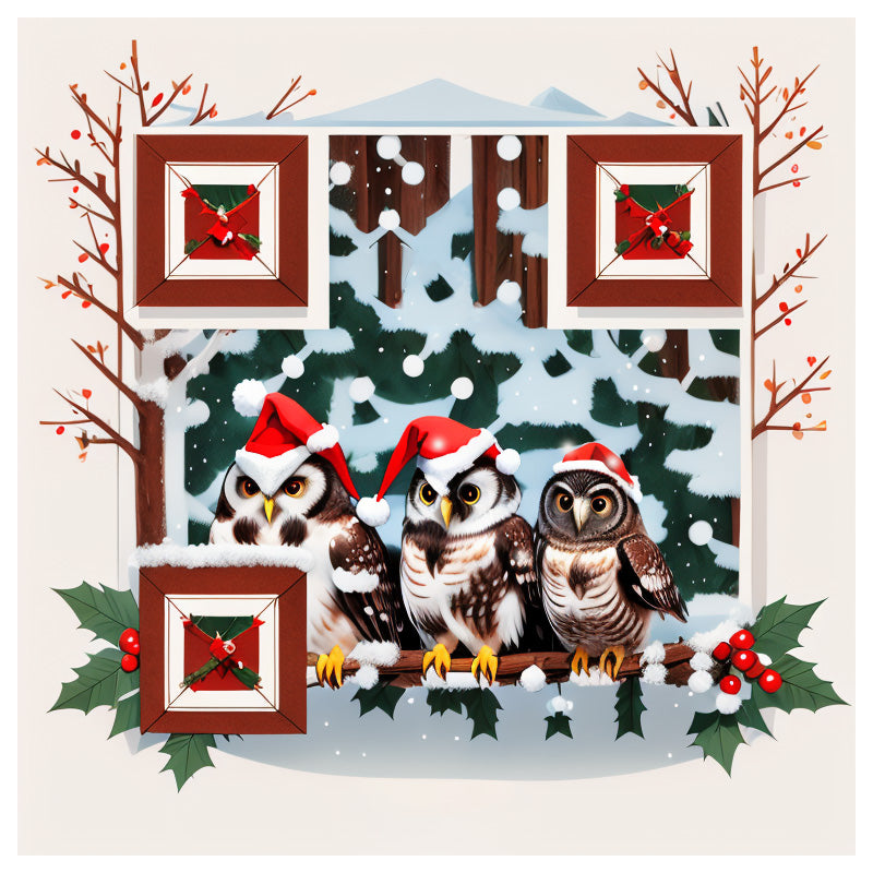 Owls donning festive Santa hats perch on a snowy branch in this enchanting artistic QR code. Set against a serene winter forest background, the New Year postcard style captures the joy of the season with adorable and detailed illustrations.